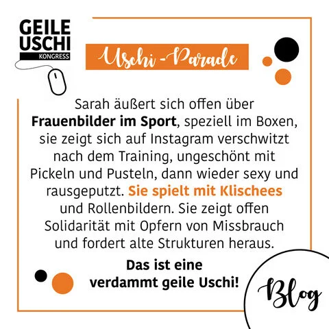 Sarah äußert sich also offen über Frauenbilder im Sport, speziell im Boxen, sie zeigt sich auf Instagram verschwitzt nach dem Training, ungeschönt mit Pickeln und Pusteln, dann wieder sexy und rausgeputzt. Sie spielt mit Klischees und Rollenbildern. Sie zeigt offen Solidarität mit Opfern von Missbrauch und fordert alte Strukturen heraus. Das ist eine verdammt geile Uschi!