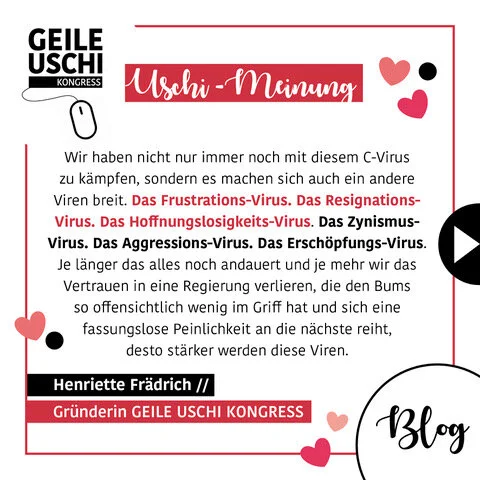 Genauso liegt es an uns zu entscheiden, mit welchen Vibes, Gedanken, Stimmungen und Energien wir unser Umfeld „anstecken“. Pusten wir die „guten Viren“ in die Welt? Oder die „schlechten“? Wollen wir ein guter Virus sein oder ein schlechter?