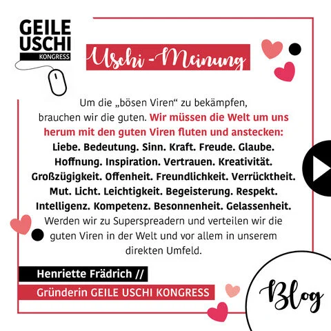 Werden wir zu Superspreadern und verteilen wir die guten Viren in der Welt und vor allem in unserem direkten Umfeld. Denn Viren sind ansteckend. Das, mit dem wir andere „anstecken“, wird weitergetragen. Ja, der Begriff „Superspreader“ hat ein Image-Problem. Niemand will ein Superspreader sein. Niemand will sich in der Nähe eines Superspreaders aufhalten. Und jetzt komme ich und sage, hey, lasst uns alle Superspreader sein?! Oh yes. Denn es liegt an uns, den Virus anders zu beladen.